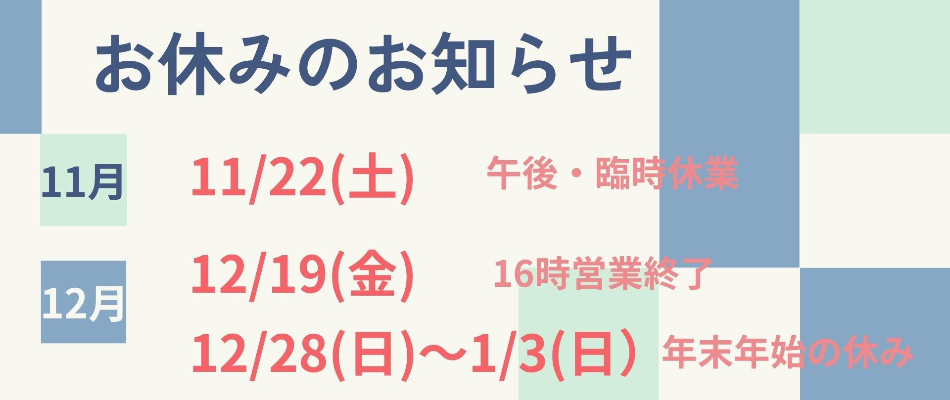 - 2025-11-0311月・12月のお休み