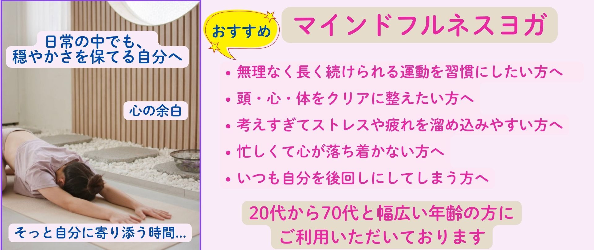 初めてでも安心、ヨガ初心者にもおすすめなヨガ教室です。ご自身の身体に寄り添いながら動くことで、心も身体も整い、癒しが訪れる心地の良い時間を提供しております